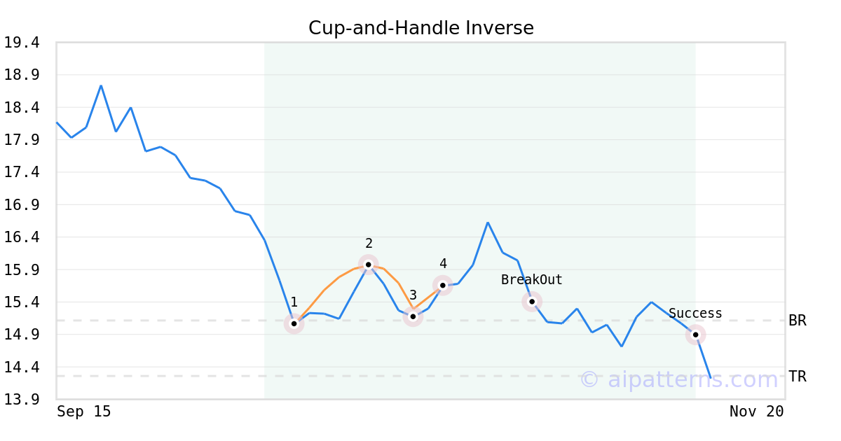 On October 21, 2025, A.I.dvisor detected a Cup-and-Handle Inverse Pattern (Bearish) for JJill (JILL, $15.65). 8 days later, on October 29, 2025, A.I.dvisor confirmed the Bearish pattern, setting a target price of the stock. On November 13, 2025, the stock hit the target price of $14.26 – resulting in a gain for traders who shorted the stock on the pattern detection date.