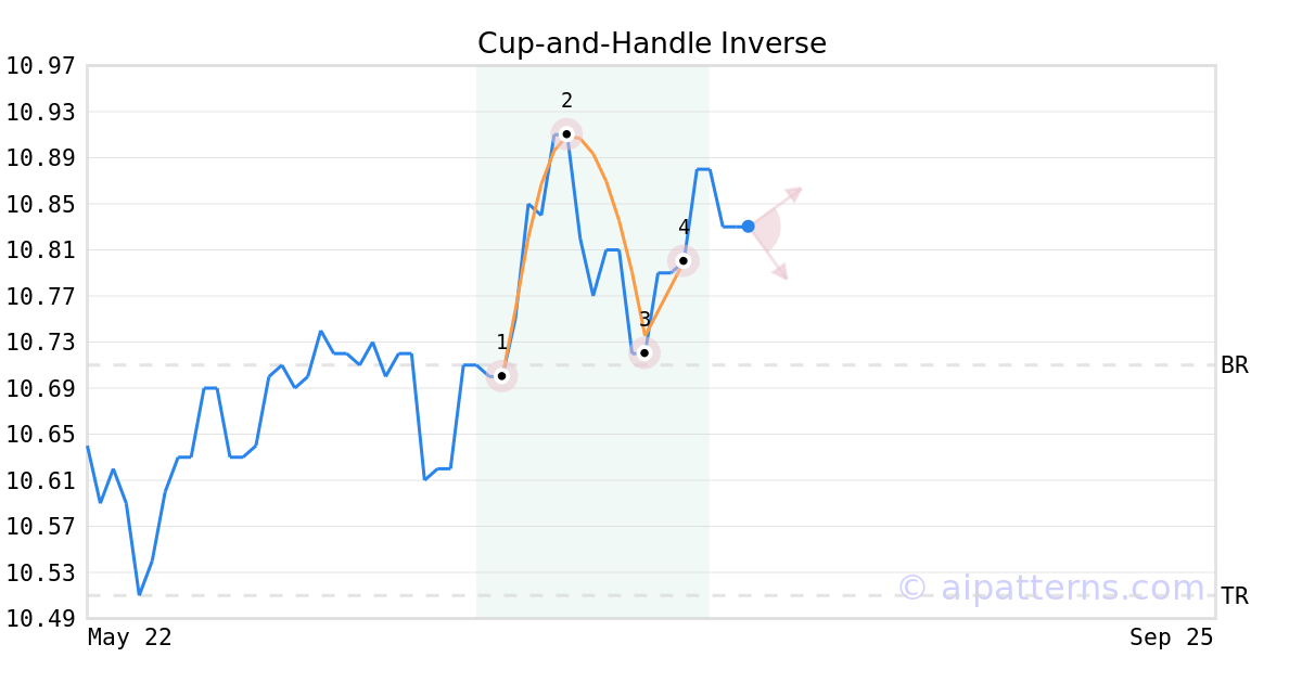 A.I.dvisor detected a bearish Cup-and-Handle Inverse pattern for JLMOX stock. This pattern was detected on July 30, 2024 . The odds of reaching the target price are 6. The Inverted Cup-and-Handle (sometimes called Inverted Cup-and-Holder) pattern forms when prices rise then decline to create an upside-down “U”like shape (1, 2, 3, also known as the Cup), followed by a shorter relatively straight price increase that bounces from the right lip (from 3 to 4, creating the Handle). Consider selling the security short or buying a put option at the downward breakout level. The confirmation move is the breakout of the price below the right cup lip.