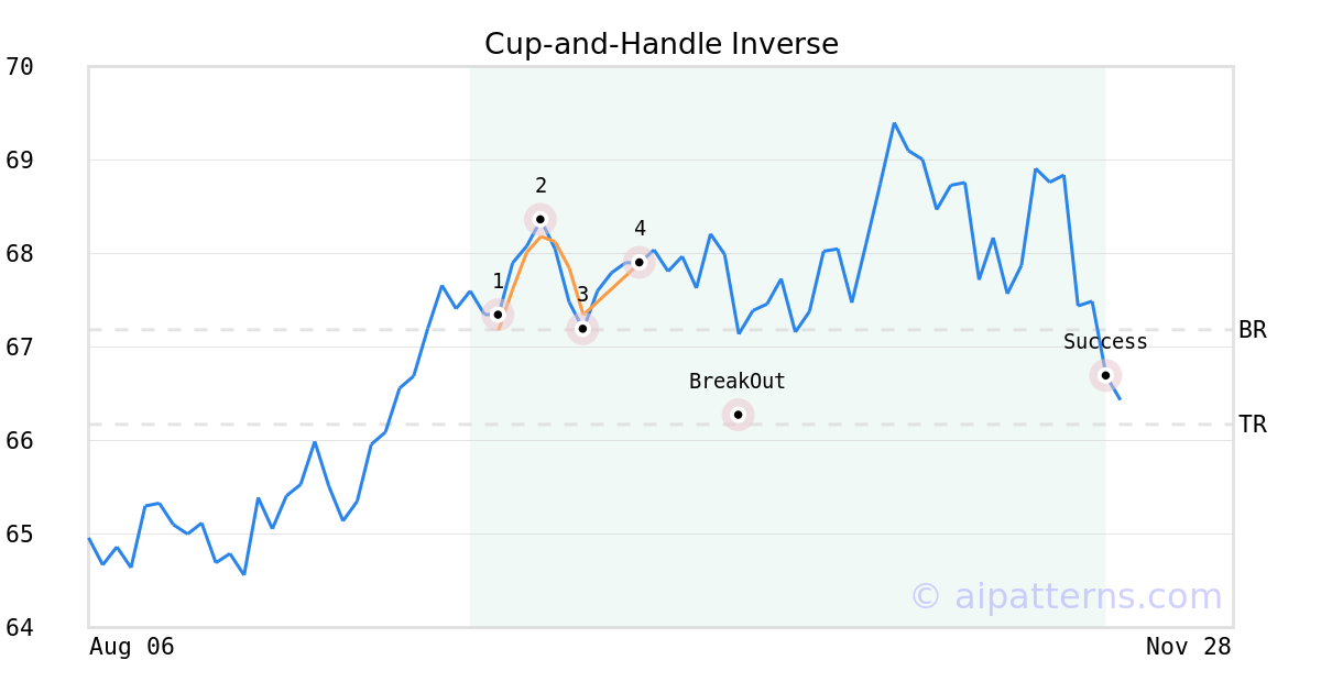 On October 01, 2025, A.I.dvisor detected a Cup-and-Handle Inverse Pattern (Bearish) for JPMorgan US Momentum Factor ETF (JMOM, $67.90). 9 days later, on October 10, 2025, A.I.dvisor confirmed the Bearish pattern, setting a target price of the stock. On November 17, 2025, the stock hit the target price of $66.17 – resulting in a gain for traders who shorted the stock on the pattern detection date.