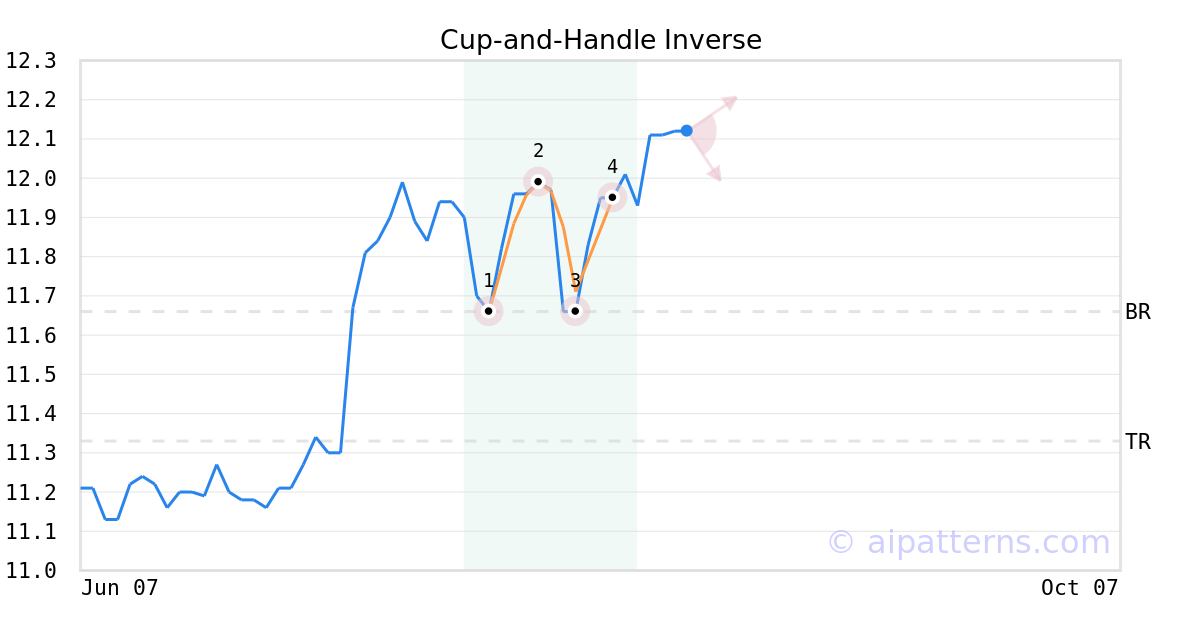 A.I.dvisor detected a bearish Cup-and-Handle Inverse pattern for JNGSX stock. This pattern was detected on August 09, 2024 . The odds of reaching the target price are 6. The Inverted Cup-and-Handle (sometimes called Inverted Cup-and-Holder) pattern forms when prices rise then decline to create an upside-down “U”like shape (1, 2, 3, also known as the Cup), followed by a shorter relatively straight price increase that bounces from the right lip (from 3 to 4, creating the Handle). Consider selling the security short or buying a put option at the downward breakout level. The confirmation move is the breakout of the price below the right cup lip.