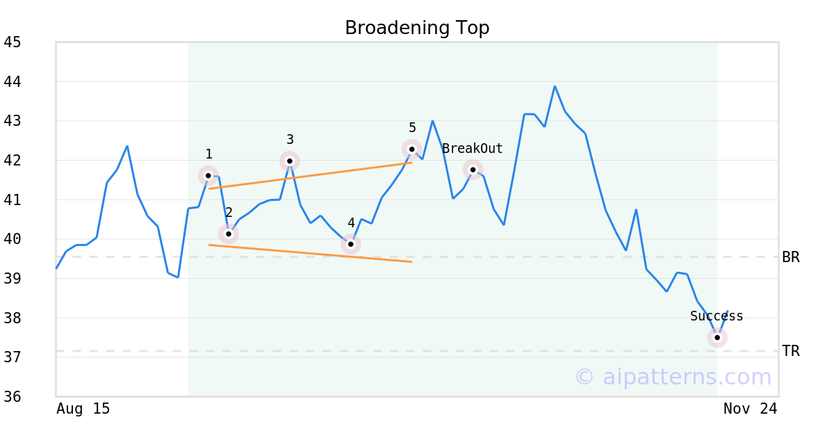 On October 06, 2025, A.I.dvisor detected a Broadening Top Pattern (Bearish) for Johnson Outdoors (JOUT, $41.94). 8 days later, on October 14, 2025, A.I.dvisor confirmed the Bearish pattern, setting a target price of the stock. On November 17, 2025, the stock hit the target price of $37.16 – resulting in a +1 gain for traders who shorted the stock on the pattern detection date.