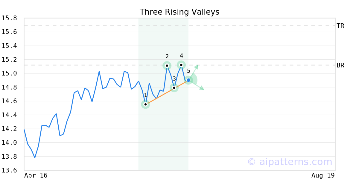 A.I.dvisor detected a bullish Three Rising Valleys pattern for JSJCX stock. This pattern was detected on June 21, 2024 . The odds of reaching the target price are 6. The Three Rising Valleys pattern forms when three minor Lows (1, 3, 5) are arranged along an upward sloping trend line. Consider buying a security or call option at the breakout price level. When trading, wait for the confirmation move, which is when the price rises above the breakout level.