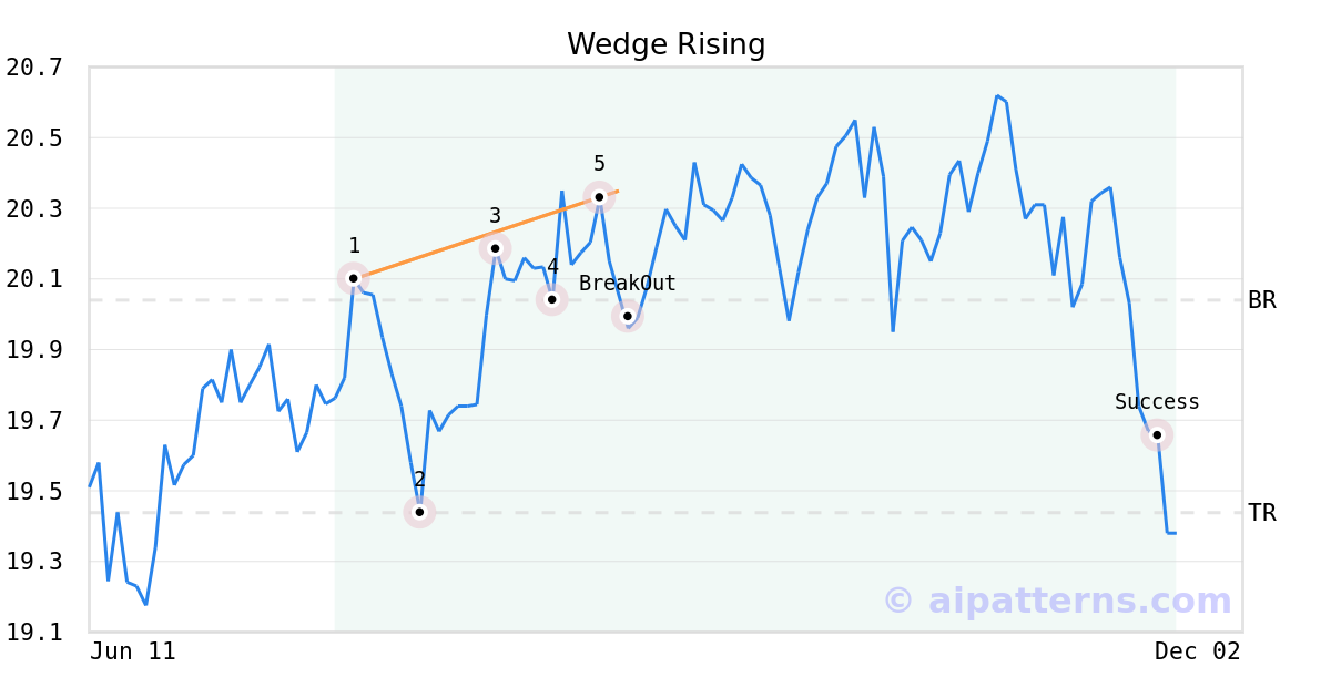 On August 28, 2025, A.I.dvisor detected a Wedge Rising Pattern (Bearish) for Adasina Social Justice All Cp Glbl ETF (JSTC, $20.33). 5 days later, on September 02, 2025, A.I.dvisor confirmed the Bearish pattern, setting a target price of the stock. On November 19, 2025, the stock hit the target price of $19.44 – resulting in a gain for traders who shorted the stock on the pattern detection date.