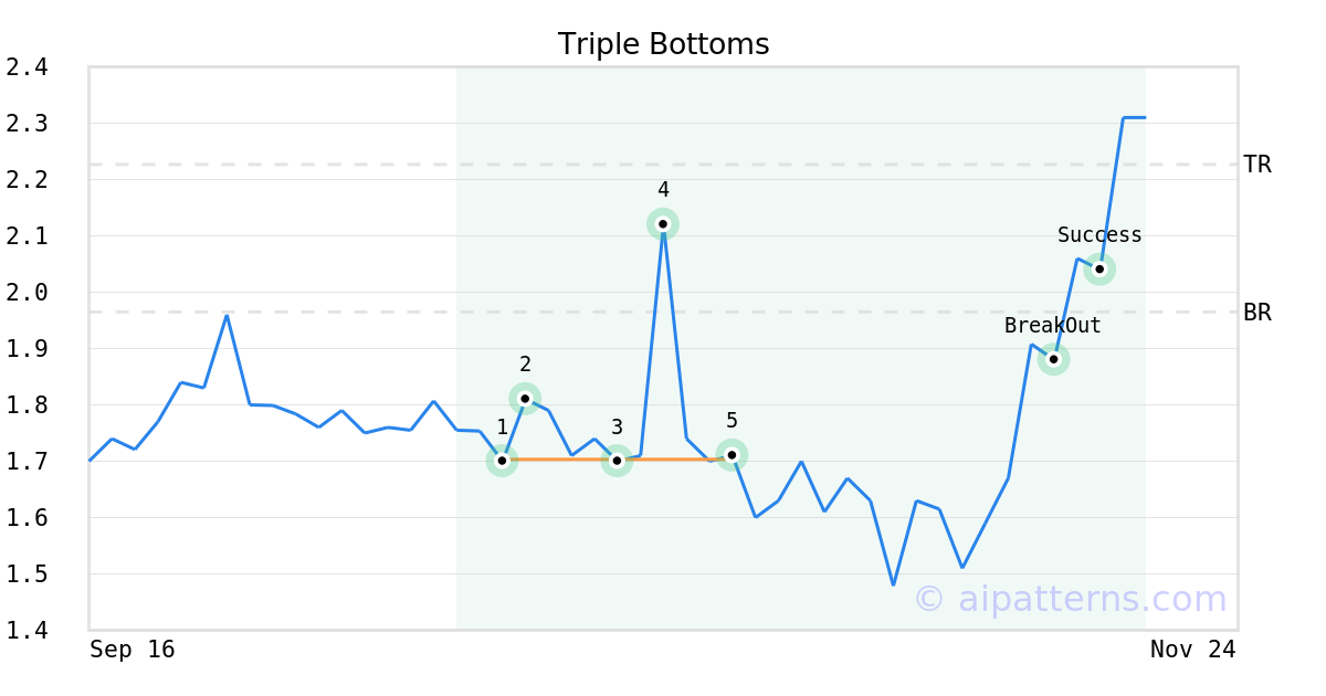On October 24, 2025, A.I.dvisor detected a Triple Bottoms Pattern (Bullish) for Jowell Global Ltd (JWEL, $1.71). On November 13, 2025, A.I.dvisor confirmed the Bullish pattern, setting a target price of $2.23. 4 days later, on November 17, 2025, JWEL reached the target price resulting in a +1 for traders who took a long position in the stock.