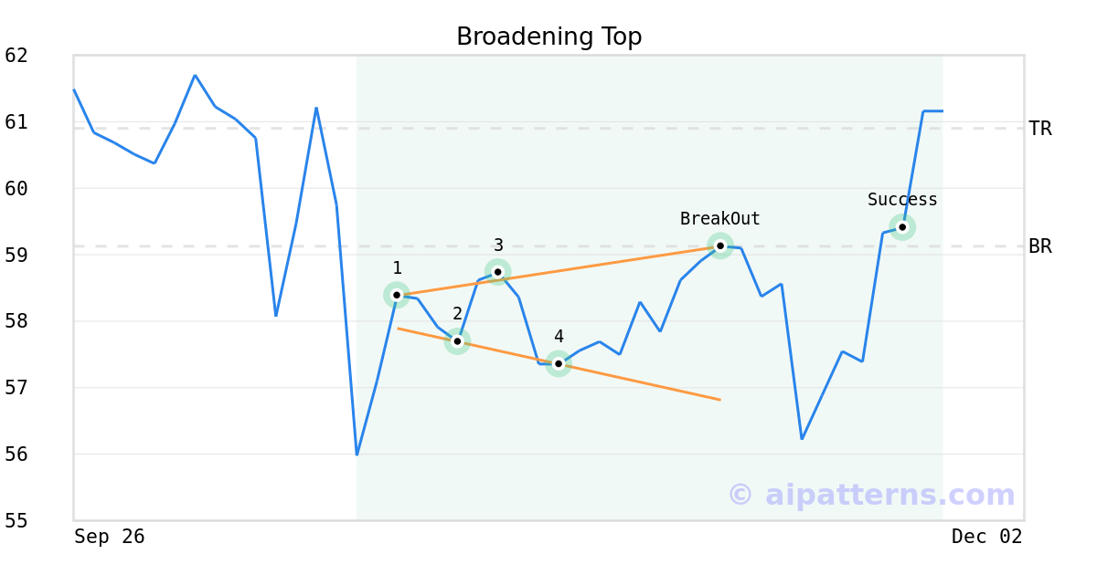 On November 11, 2025, A.I.dvisor detected a Broadening Top Pattern (Bullish) for Invesco KBW Regional Banking ETF (KBWR, $59.13). On November 11, 2025, A.I.dvisor confirmed the Bullish pattern, setting a target price of $60.90. 13 days later, on November 24, 2025, KBWR reached the target price resulting in a for traders who took a long position in the stock.