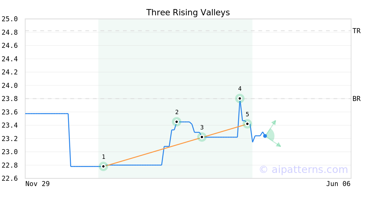 The Three Rising Valleys pattern forms when three minor Lows (1, 3, 5) are arranged along an upward sloping trend line.