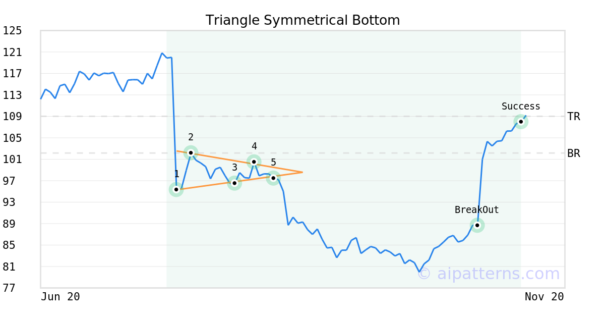 On August 28, 2025, A.I.dvisor detected a Triangle Symmetrical Bottom Pattern (Bullish) for Kirby Corp (KEX, $97.44). On October 28, 2025, A.I.dvisor confirmed the Bullish pattern, setting a target price of $109.01. 13 days later, on November 10, 2025, KEX reached the target price resulting in a +1 for traders who took a long position in the stock.