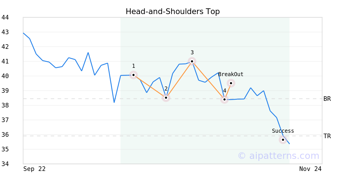 On November 05, 2025, A.I.dvisor detected a Head-and-Shoulders Top Pattern (Bearish) for Kulicke and Soffa Industries (KLIC, $39.50). On November 05, 2025, A.I.dvisor confirmed the Bearish pattern, setting a target price of the stock. On November 17, 2025, the stock hit the target price of $35.91 – resulting in a gain for traders who shorted the stock on the pattern detection date.