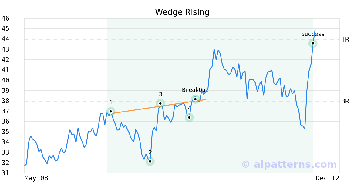 On September 08, 2025, A.I.dvisor detected a Wedge Rising Pattern (Bullish) for Kulicke and Soffa Industries (KLIC, $37.96). On September 08, 2025, A.I.dvisor confirmed the Bullish pattern, setting a target price of $43.97. 78 days later, on November 25, 2025, KLIC reached the target price resulting in a +1 for traders who took a long position in the stock.