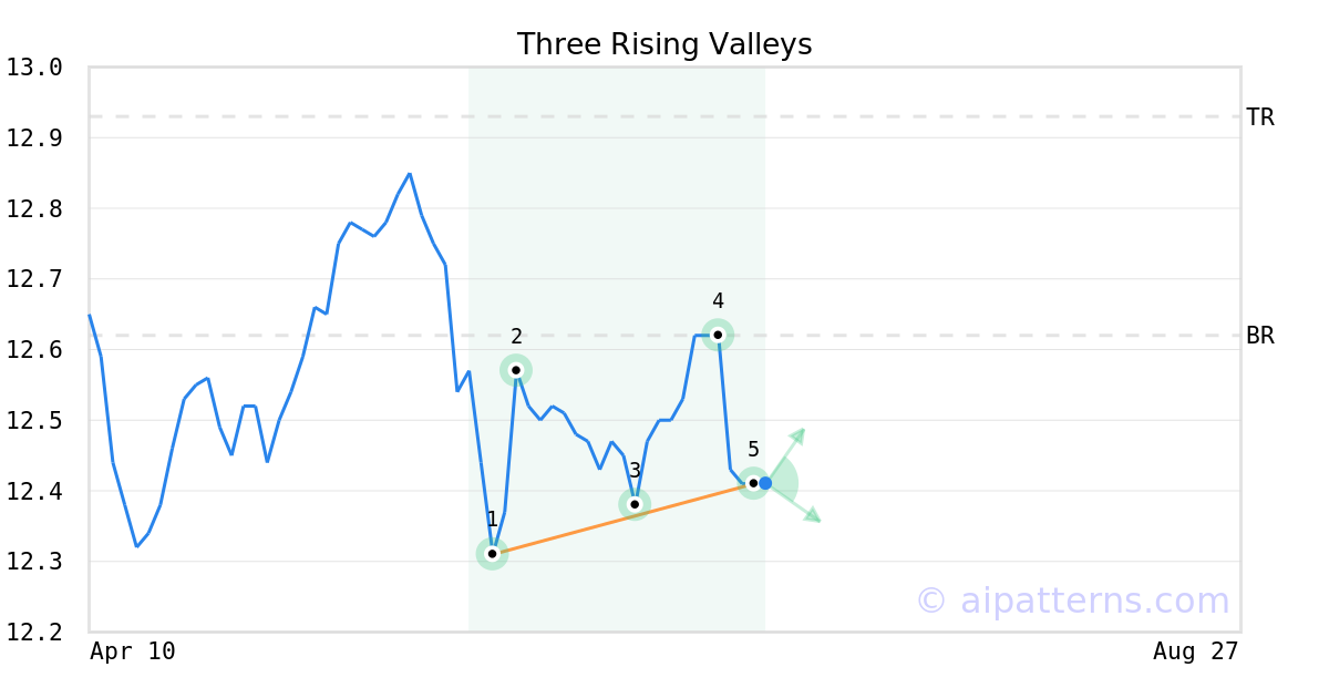 A.I.dvisor detected a bullish Three Rising Valleys pattern for KNGIX stock. This pattern was detected on July 01, 2024 . The odds of reaching the target price are . The Three Rising Valleys pattern forms when three minor Lows (1, 3, 5) are arranged along an upward sloping trend line. Consider buying a security or call option at the breakout price level. When trading, wait for the confirmation move, which is when the price rises above the breakout level.
