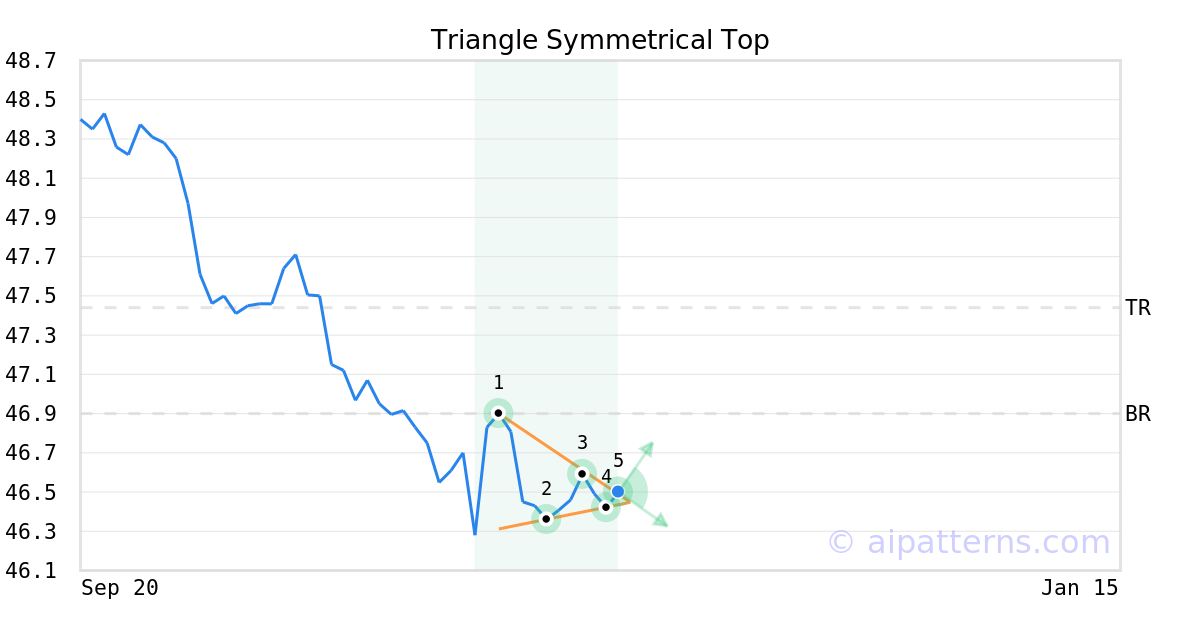 The Symmetrical Triangle Top pattern forms when the price of a security fails to retest a high or low and ultimately forms two narrowing trend lines.