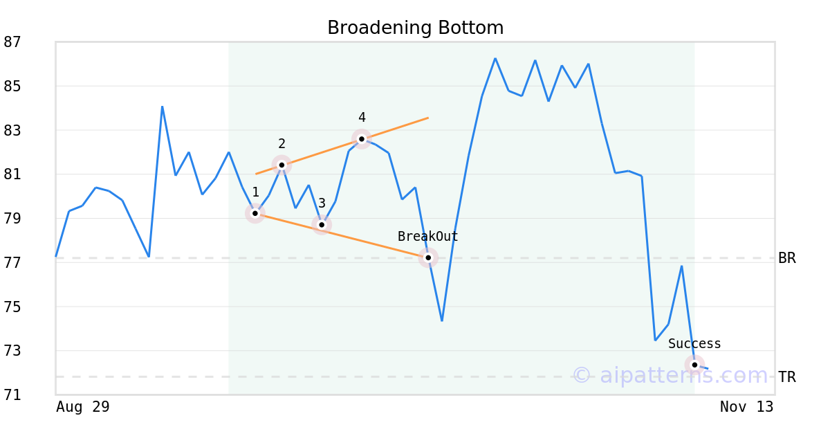 On October 09, 2025, A.I.dvisor detected a Broadening Bottom Pattern (Bearish) for Kontoor Brands (KTB, $77.20). On October 09, 2025, A.I.dvisor confirmed the Bearish pattern, setting a target price of the stock. On November 06, 2025, the stock hit the target price of $71.82 – resulting in a gain for traders who shorted the stock on the pattern detection date.