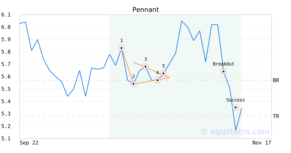 On October 24, 2025, A.I.dvisor detected a Pennant Pattern (Bearish) for KVH Industries (KVHI, $5.63). 13 days later, on November 06, 2025, A.I.dvisor confirmed the Bearish pattern, setting a target price of the stock. On November 10, 2025, the stock hit the target price of $5.28 – resulting in a gain for traders who shorted the stock on the pattern detection date.