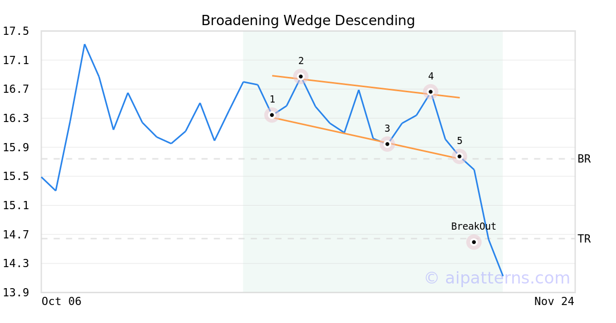 On November 14, 2025, A.I.dvisor detected a Broadening Wedge Descending Pattern (Bearish) for Lakeland Industries (LAKE, $15.74). 3 days later, on November 17, 2025, A.I.dvisor confirmed the Bearish pattern, setting a target price of the stock. On November 17, 2025, the stock hit the target price of $14.64 – resulting in a gain for traders who shorted the stock on the pattern detection date.