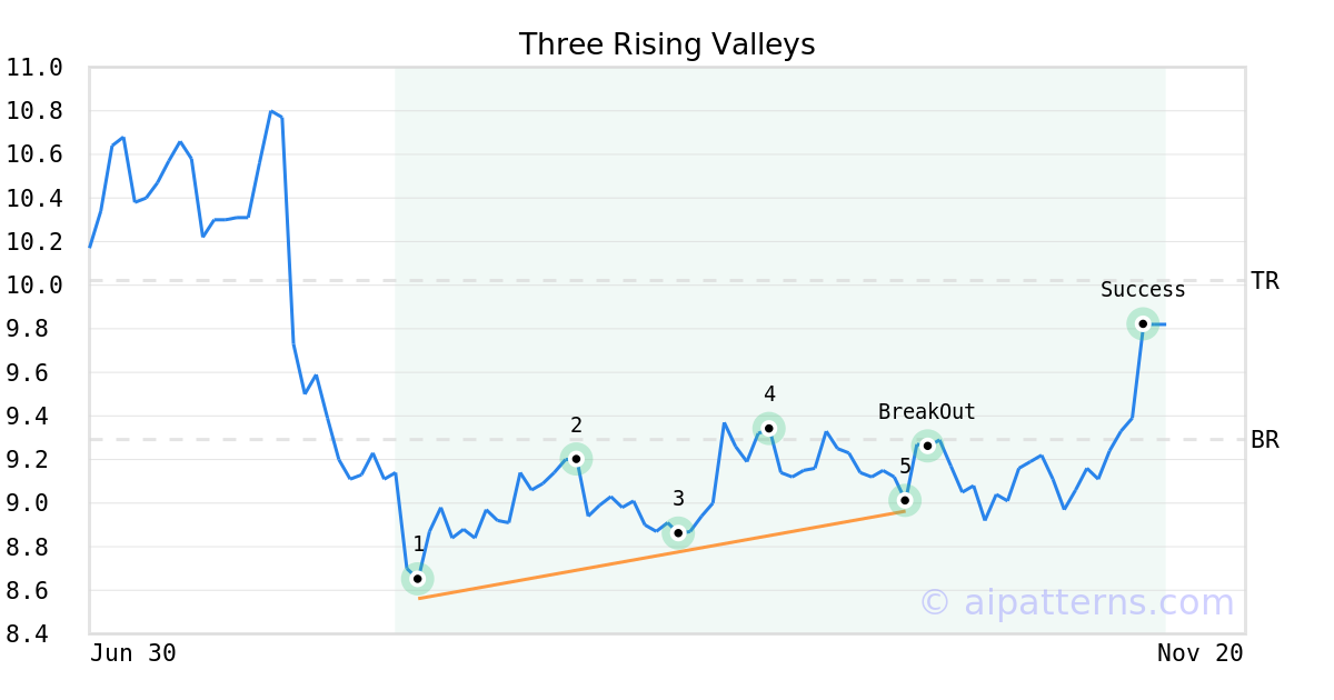 On October 10, 2025, A.I.dvisor detected a Three Rising Valleys Pattern (Bullish) for Gladstone Land Corp (LAND, $8.96). On October 14, 2025, A.I.dvisor confirmed the Bullish pattern, setting a target price of $10.02. 27 days later, on November 10, 2025, LAND reached the target price resulting in a for traders who took a long position in the stock.