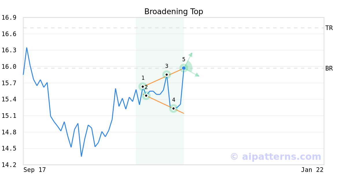 A.I.dvisor detected a bullish Broadening Top pattern for LCNB stock. This pattern was detected on November 21, 2025 . The odds of reaching the target price are 6.