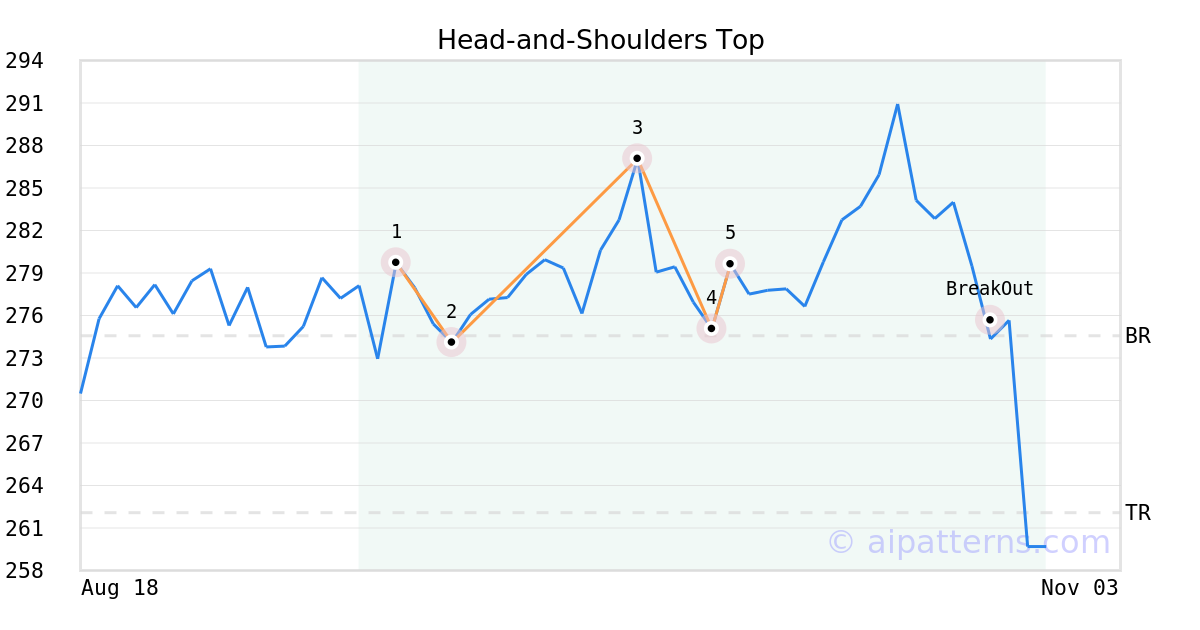 On October 07, 2025, A.I.dvisor detected a Head-and-Shoulders Top Pattern (Bearish) for Laboratory Corp (LH, $279.62). 20 days later, on October 27, 2025, A.I.dvisor confirmed the Bearish pattern, setting a target price of the stock. On October 27, 2025, the stock hit the target price of $262.08 – resulting in a gain for traders who shorted the stock on the pattern detection date.