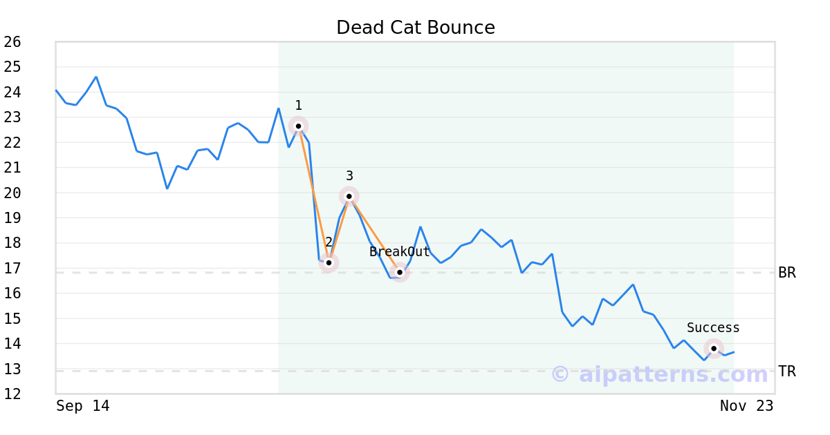 On October 18, 2025, A.I.dvisor detected a Dead Cat Bounce Pattern (Bearish) for Chainlink cryptocurrency (LINK.X, $16.820730). On October 18, 2025, A.I.dvisor confirmed the Bearish pattern, setting a target price of the stock. On November 18, 2025, the stock hit the target price of $12.907000 – resulting in a +1 gain for traders who shorted the stock on the pattern detection date.