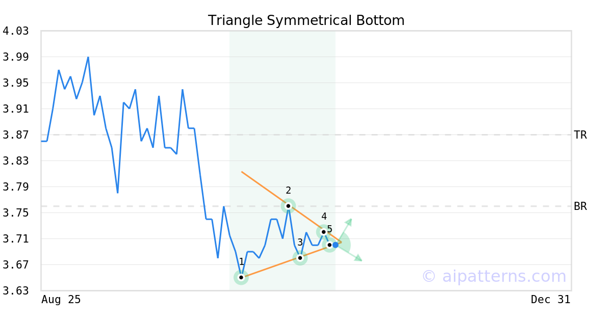 The Symmetrical Triangle Bottom pattern forms when the price of a security fails to retest a high or a low and ultimately forms two narrowing trend lines. As the support and resistance levels consolidate, they form a triangle.