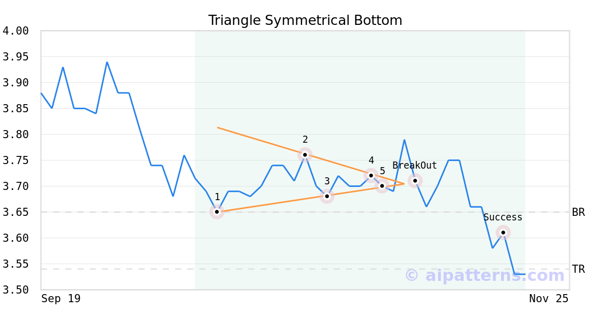 On November 03, 2025, A.I.dvisor detected a Triangle Symmetrical Bottom Pattern (Bearish) for BrasilAgro - Companhia Brasileira de Propriedades Agricolas (LND, $3.70). 3 days later, on November 06, 2025, A.I.dvisor confirmed the Bearish pattern, setting a target price of the stock. On November 18, 2025, the stock hit the target price of $3.54 – resulting in a gain for traders who shorted the stock on the pattern detection date.