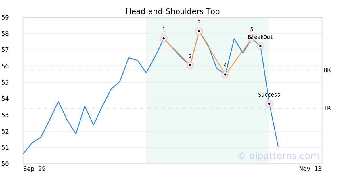 On November 04, 2025, A.I.dvisor detected a Head-and-Shoulders Top Pattern (Bearish) for Lantheus Holdings (LNTH, $57.71). 1 day later, on November 05, 2025, A.I.dvisor confirmed the Bearish pattern, setting a target price of the stock. On November 06, 2025, the stock hit the target price of $53.42 – resulting in a gain for traders who shorted the stock on the pattern detection date.