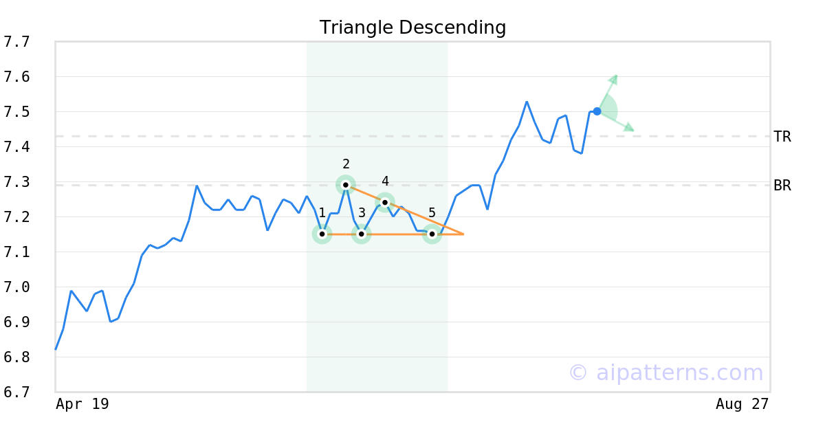 A.I.dvisor detected a bullish Triangle Descending pattern for LPEIX stock. This pattern was detected on July 01, 2024 . The odds of reaching the target price are . The Descending Triangle pattern is formed when the price of a security establishes a support level (1, 3, 5) and bounces off that level to a declining resistance level, creating a down-sloping top line (2, 4). Consider buying a security or call option at the breakout price level. When trading, wait for the confirmation move, which is when the price rises above the breakout level.
