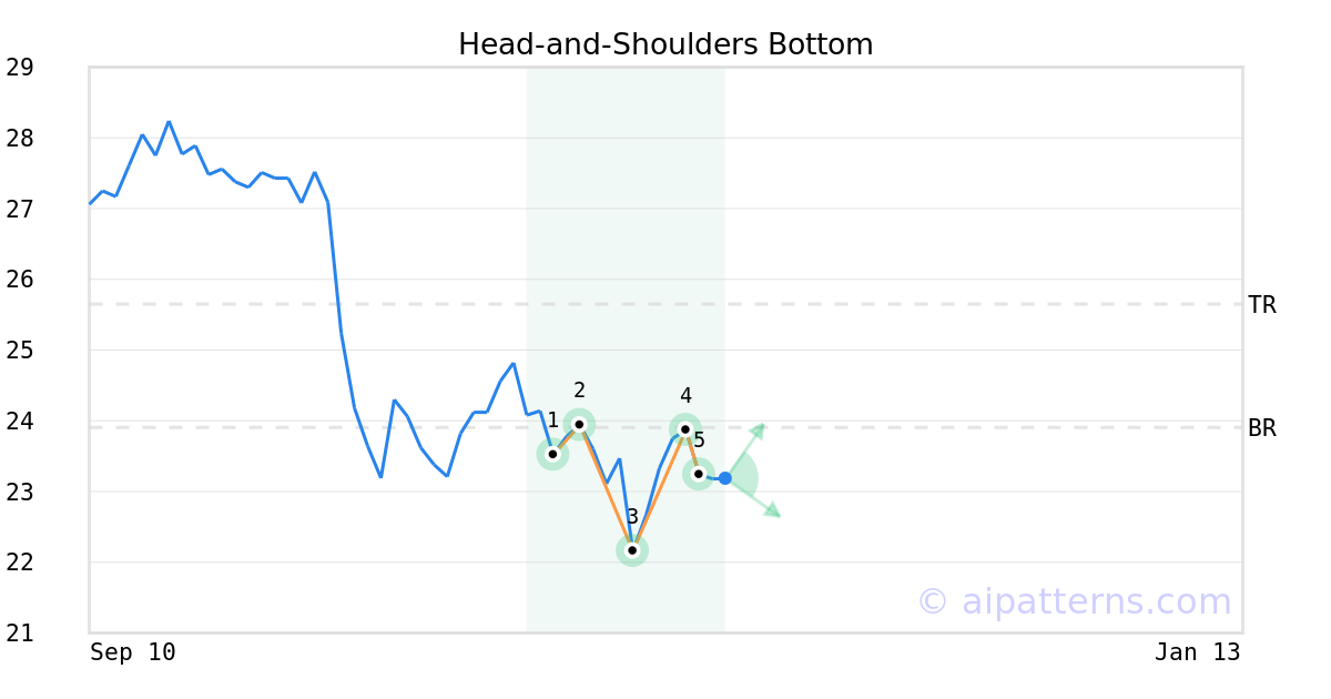 The Head-and-Shoulders Bottom pattern is formed when the price of a security creates a center trough (the inverted head, labeled 3) and the left and right inverted shoulders (1, 5). After reaching the lowest low (the Head, 3) the next low is shallower and the trend reverses course to the upside.