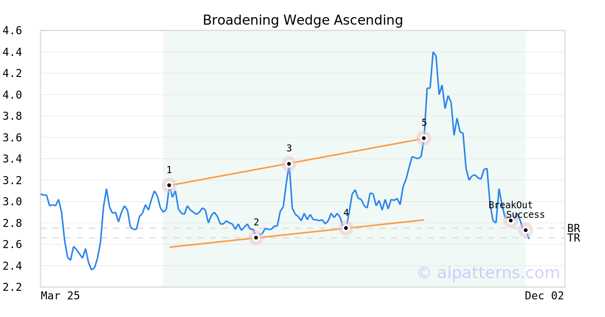 On September 26, 2025, A.I.dvisor detected a Broadening Wedge Ascending Pattern (Bearish) for Lufax Holding Ltd (LU, $3.59). 41 days later, on November 06, 2025, A.I.dvisor confirmed the Bearish pattern, setting a target price of the stock. On November 13, 2025, the stock hit the target price of $2.66 – resulting in a +2 gain for traders who shorted the stock on the pattern detection date.