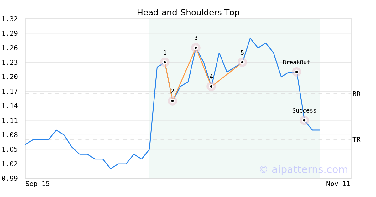 On October 23, 2025, A.I.dvisor detected a Head-and-Shoulders Top Pattern (Bearish) for Lucid Diagnostics (LUCD, $1.23). 11 days later, on November 03, 2025, A.I.dvisor confirmed the Bearish pattern, setting a target price of the stock. On November 04, 2025, the stock hit the target price of $1.07 – resulting in a gain for traders who shorted the stock on the pattern detection date.