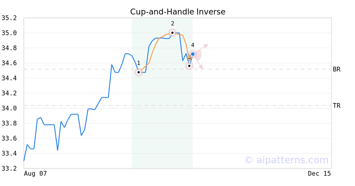 The Inverted Cup-and-Handle (sometimes called Inverted Cup-and-Holder) pattern forms when prices rise then decline to create an upside-down “U”like shape (1, 2, 3, also known as the Cup), followed by a shorter relatively straight price increase that bounces from the right lip (from 3 to 4, creating the Handle).