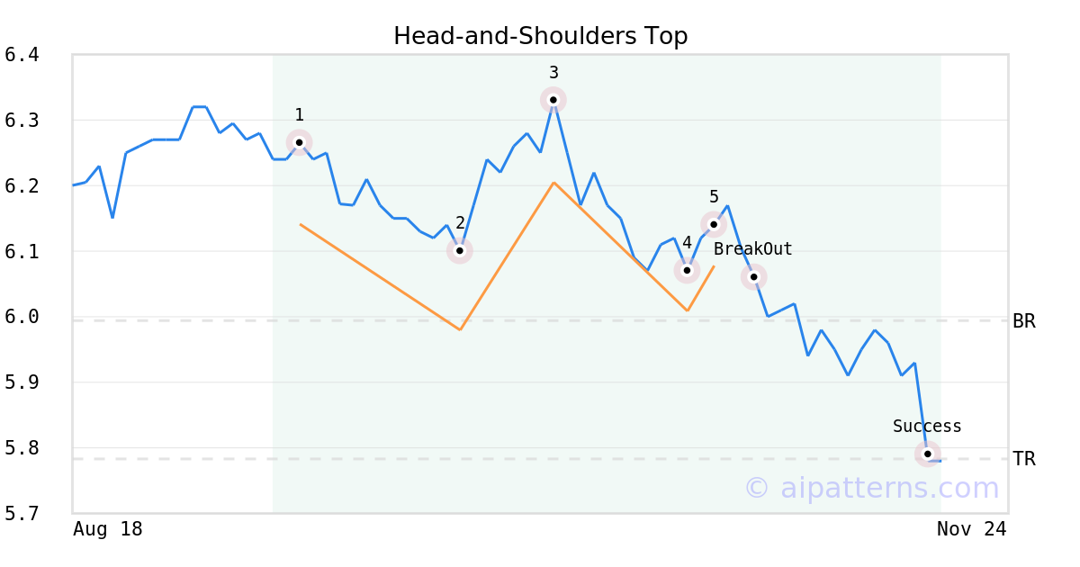 On October 24, 2025, A.I.dvisor detected a Head-and-Shoulders Top Pattern (Bearish) for Madison Covered Call & Equity Strategy Fund (MCN, $6.08). 5 days later, on October 29, 2025, A.I.dvisor confirmed the Bearish pattern, setting a target price of the stock. On November 17, 2025, the stock hit the target price of $5.78 – resulting in a gain for traders who shorted the stock on the pattern detection date.