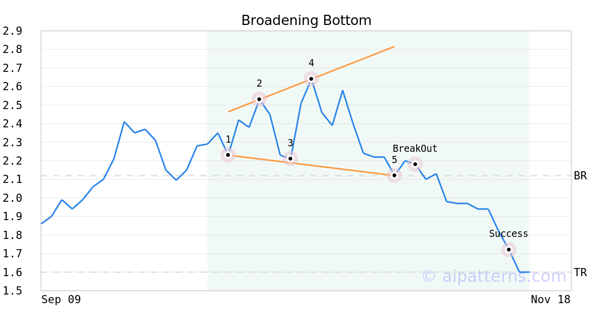 On October 27, 2025, A.I.dvisor detected a Broadening Bottom Pattern (Bearish) for Spectral AI (MDAI, $2.12). 2 days later, on October 29, 2025, A.I.dvisor confirmed the Bearish pattern, setting a target price of the stock. On November 11, 2025, the stock hit the target price of $1.60 – resulting in a +1 gain for traders who shorted the stock on the pattern detection date.
