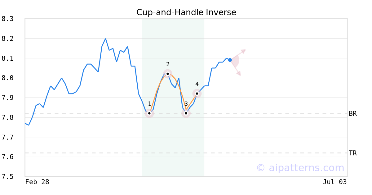 A.I.dvisor detected a bearish Cup-and-Handle Inverse pattern for MDVWX stock. This pattern was detected on May 06, 2024 . The odds of reaching the target price are 6. The Inverted Cup-and-Handle (sometimes called Inverted Cup-and-Holder) pattern forms when prices rise then decline to create an upside-down “U”like shape (1, 2, 3, also known as the Cup), followed by a shorter relatively straight price increase that bounces from the right lip (from 3 to 4, creating the Handle). Consider selling the security short or buying a put option at the downward breakout level. The confirmation move is the breakout of the price below the right cup lip.