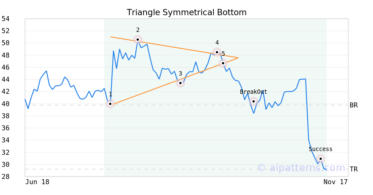 On September 22, 2025, A.I.dvisor detected a Triangle Symmetrical Bottom Pattern (Bearish) for Direxion Daily META Bull 2X ETF (METU, $46.43). 14 days later, on October 06, 2025, A.I.dvisor confirmed the Bearish pattern, setting a target price of the stock. On November 05, 2025, the stock hit the target price of $29.22 – resulting in a +3 gain for traders who shorted the stock on the pattern detection date.