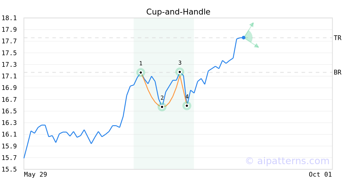 A.I.dvisor detected a bullish Cup-and-Handle pattern for MGLCX stock. This pattern was detected on August 05, 2024 . The odds of reaching the target price are . The Cup-and-Handle (sometimes called Cup-and-Holder) pattern is formed when the price of a security initially declines and then rises to form a “U”-like rounded shape (1, 2, 3, also known as the Cup). Once it forms the right lip, it is characterized by short, relatively straight price decline (from 3 to 4) forming the handle. Consider buying a security or call option at the upward breakout price/entry point. The confirmation move is when the security moves past the breakout price above the right cup lip.