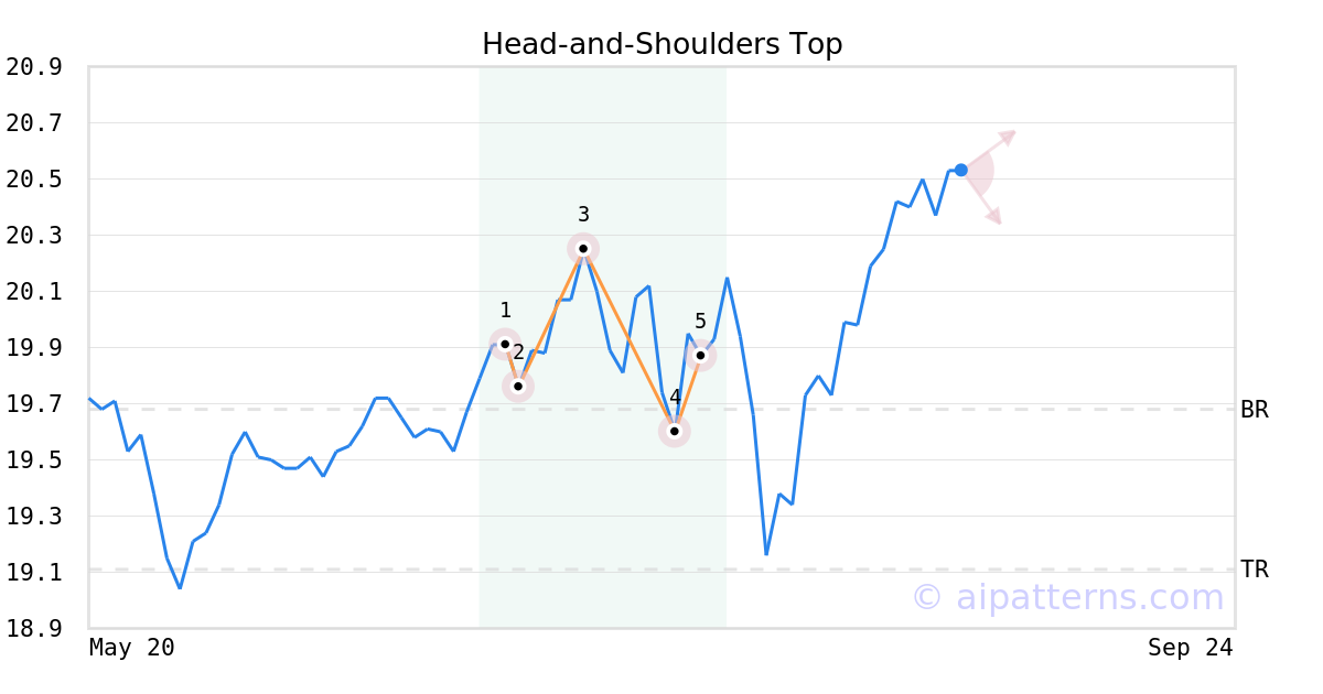 A.I.dvisor detected a bearish Head-and-Shoulders Top pattern for MGQSX stock. This pattern was detected on July 29, 2024 . The odds of reaching the target price are 6. The pattern forms with a center peak (the Head, labeled 3) and left and right Shoulders (1, 5). Eventually the security stops testing highs and reverses trend into a decline. Consider selling a security short before it declines or buying a put option to benefit from the price decline. To improve success chances, wait for a confirmation move: allow the price to break below the Neckline level (2, 4), which is calculated as the average of the two lows between the Head and the Shoulders.
