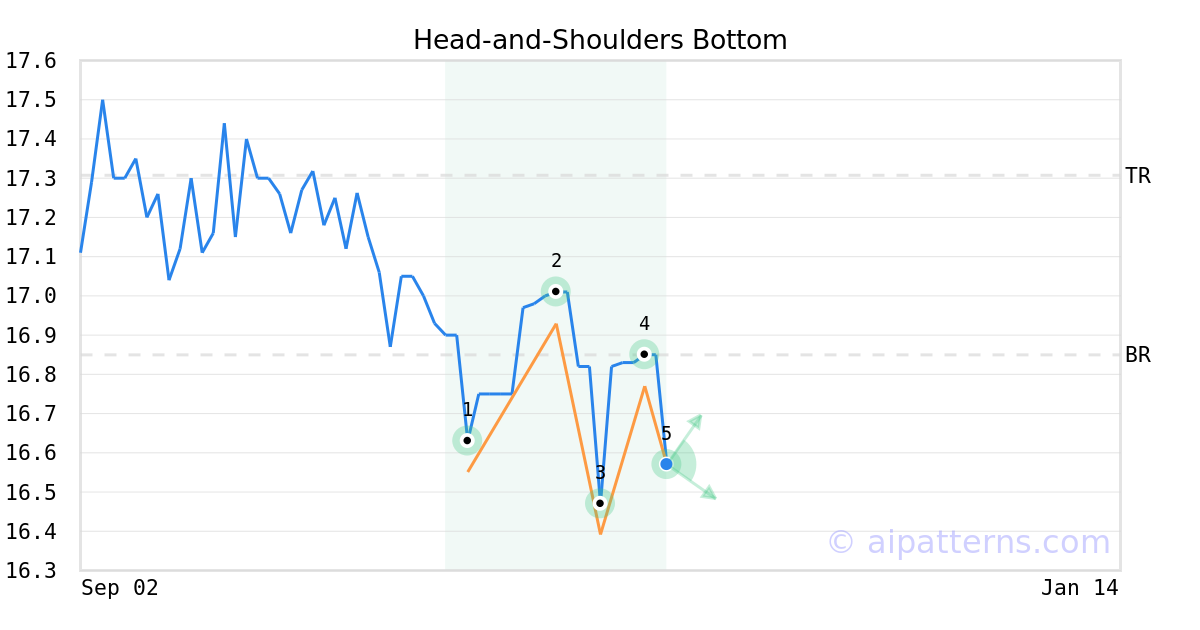 The Head-and-Shoulders Bottom pattern is formed when the price of a security creates a center trough (the inverted head, labeled 3) and the left and right inverted shoulders (1, 5). After reaching the lowest low (the Head, 3) the next low is shallower and the trend reverses course to the upside.