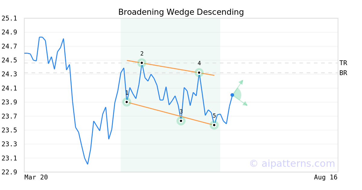 The Broadening Wedge Descending pattern forms when the price of a security makes lower lows (1, 3, 5) and lower highs (2, 4), forming a downtrend.