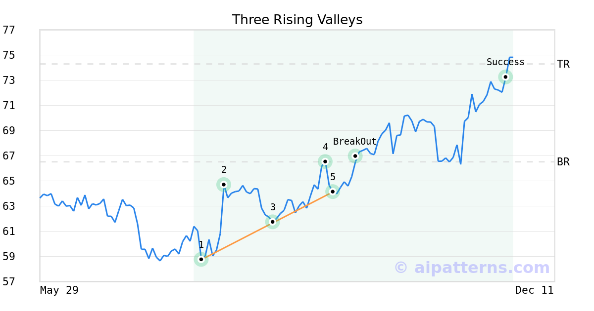 On September 19, 2025, A.I.dvisor detected a Three Rising Valleys Pattern (Bullish) for Monster Beverage Corp (MNST, $64.13). On September 29, 2025, A.I.dvisor confirmed the Bullish pattern, setting a target price of $74.29. 56 days later, on November 24, 2025, MNST reached the target price resulting in a +1 for traders who took a long position in the stock.