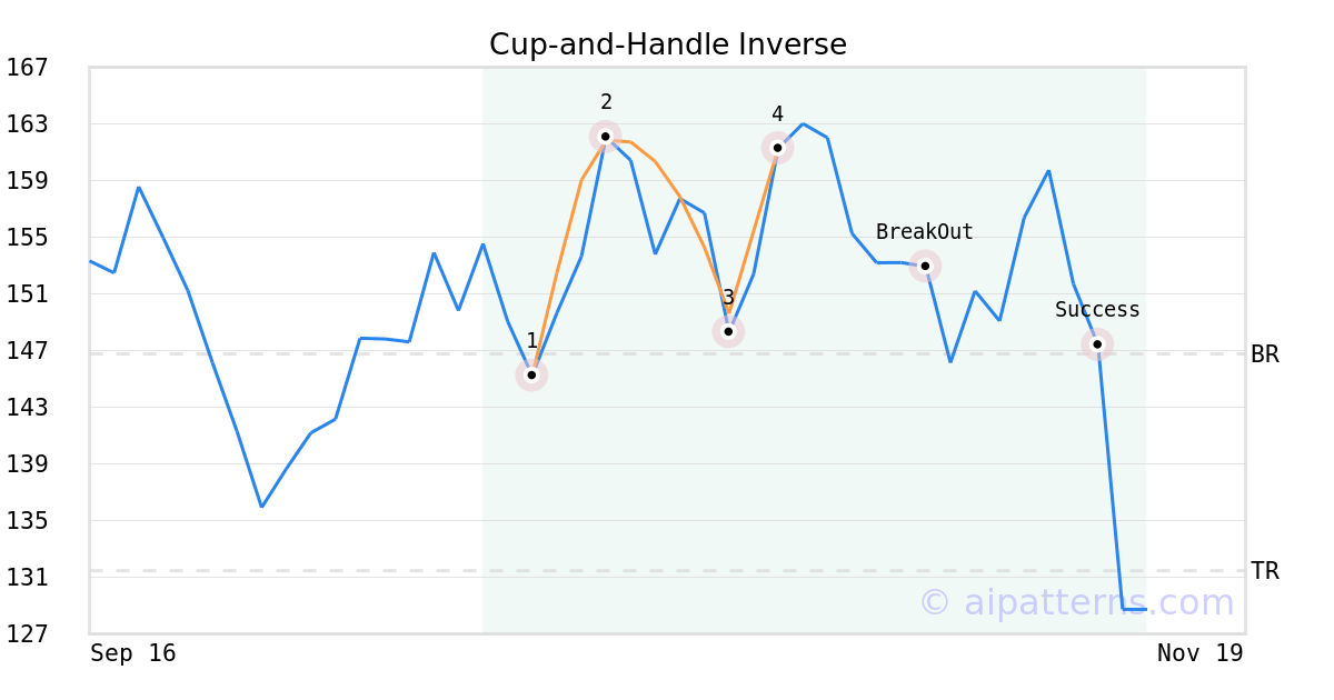 On October 24, 2025, A.I.dvisor detected a Cup-and-Handle Inverse Pattern (Bearish) for Modine Manufacturing Co (MOD, $161.27). 10 days later, on November 03, 2025, A.I.dvisor confirmed the Bearish pattern, setting a target price of the stock. On November 12, 2025, the stock hit the target price of $131.46 – resulting in a gain for traders who shorted the stock on the pattern detection date.