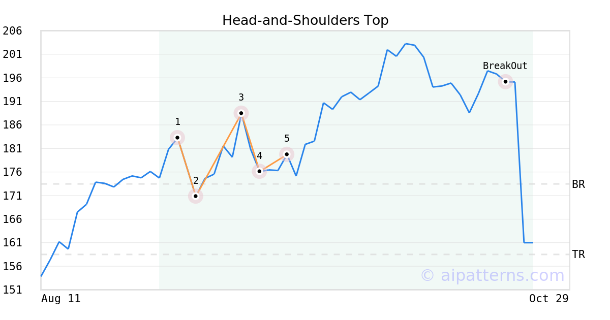 On September 18, 2025, A.I.dvisor detected a Head-and-Shoulders Top Pattern (Bearish) for Molina Healthcare (MOH, $179.71). 34 days later, on October 22, 2025, A.I.dvisor confirmed the Bearish pattern, setting a target price of the stock. On October 22, 2025, the stock hit the target price of $158.50 – resulting in a gain for traders who shorted the stock on the pattern detection date.