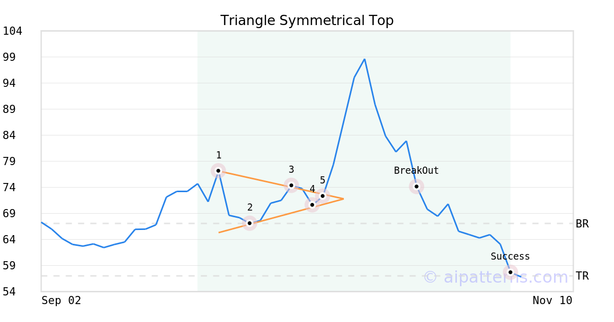 On October 09, 2025, A.I.dvisor detected a Triangle Symmetrical Top Pattern (Bearish) for MP Materials Corp (MP, $72.29). 12 days later, on October 21, 2025, A.I.dvisor confirmed the Bearish pattern, setting a target price of the stock. On November 03, 2025, the stock hit the target price of $57.01 – resulting in a +2 gain for traders who shorted the stock on the pattern detection date.