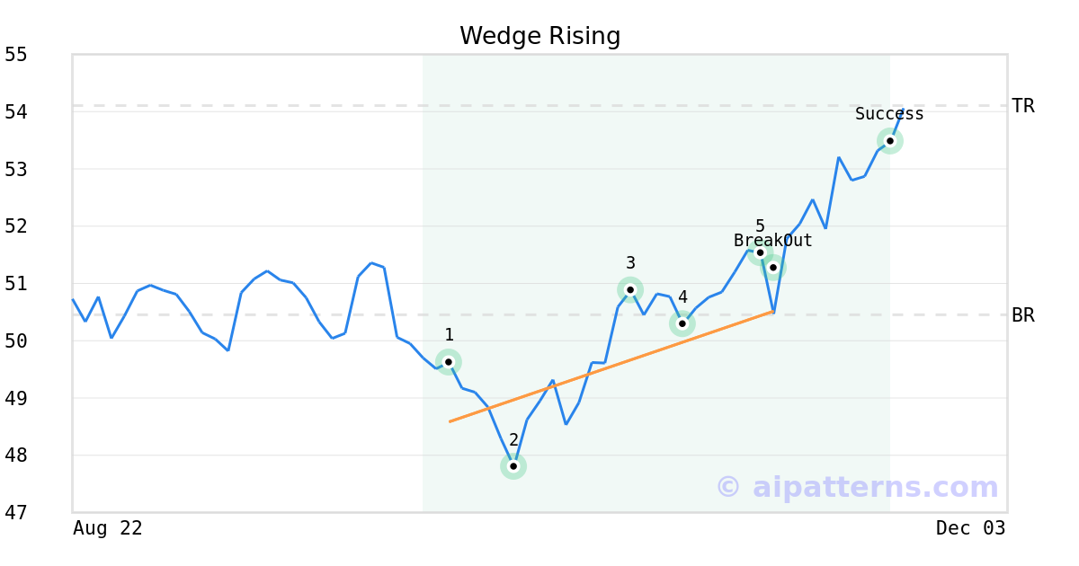 On November 06, 2025, A.I.dvisor detected a Wedge Rising Pattern (Bullish) for Mplx LP (MPLX, $50.45). On November 07, 2025, A.I.dvisor confirmed the Bullish pattern, setting a target price of $54.11. 13 days later, on November 20, 2025, MPLX reached the target price resulting in a for traders who took a long position in the stock.