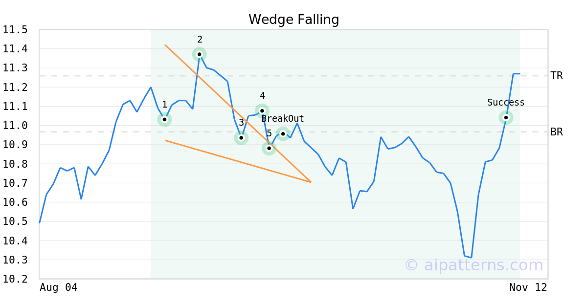 On September 19, 2025, A.I.dvisor detected a Wedge Falling Pattern (Bullish) for Direxion Daily MSFT Bear 1X ETF (MSFD, $10.77). On September 23, 2025, A.I.dvisor confirmed the Bullish pattern, setting a target price of $11.26. 43 days later, on November 05, 2025, MSFD reached the target price resulting in a for traders who took a long position in the stock.