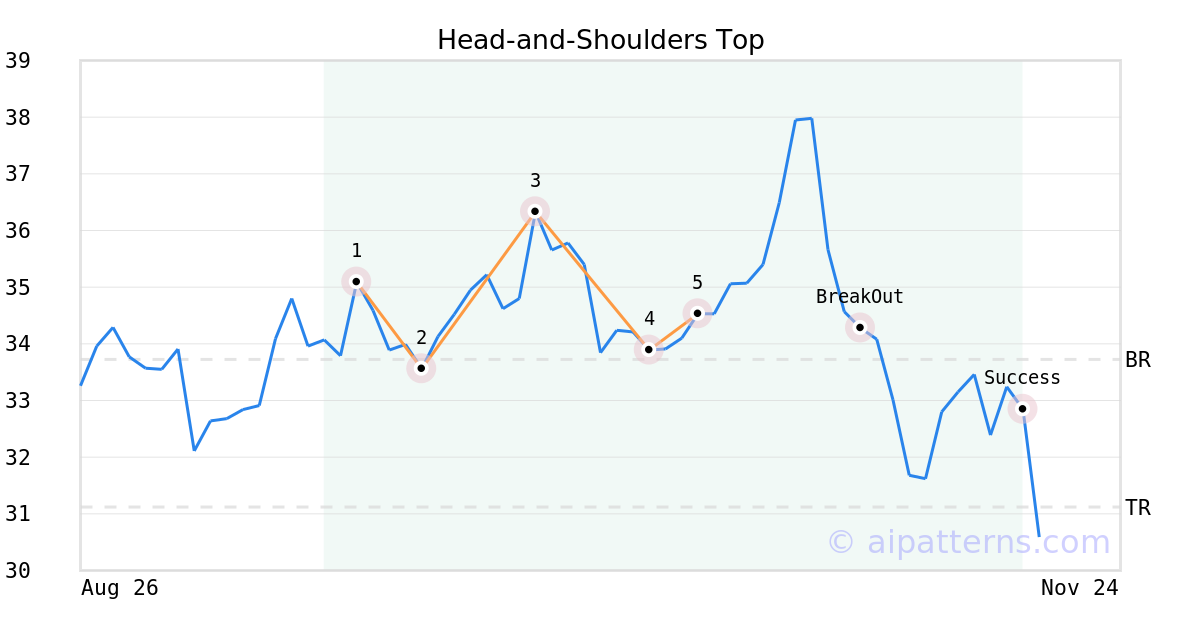 On October 20, 2025, A.I.dvisor detected a Head-and-Shoulders Top Pattern (Bearish) for T-Rex 2X Long Microsoft Daily Target ETF (MSFX, $34.53). 14 days later, on November 03, 2025, A.I.dvisor confirmed the Bearish pattern, setting a target price of the stock. On November 17, 2025, the stock hit the target price of $31.12 – resulting in a gain for traders who shorted the stock on the pattern detection date.