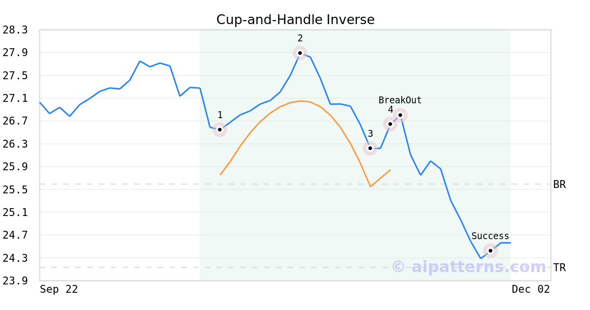 On November 10, 2025, A.I.dvisor detected a Cup-and-Handle Inverse Pattern (Bearish) for Kurv Yield Premium Str Microsoft ETF (MSFY, $25.85). 1 day later, on November 11, 2025, A.I.dvisor confirmed the Bearish pattern, setting a target price of the stock. On November 24, 2025, the stock hit the target price of $24.13 – resulting in a gain for traders who shorted the stock on the pattern detection date.
