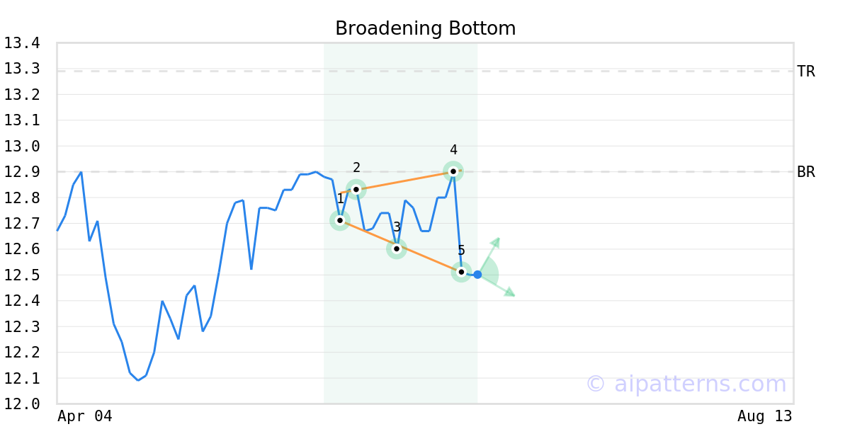 A.I.dvisor detected a bullish Broadening Bottom pattern for MSGRX stock. This pattern was detected on June 14, 2024 . The odds of reaching the target price are 6. The Broadening Bottom pattern is formed when the price of a security progressively makes higher highs (2, 4) and lower lows (1, 3, 5) following two widening trend lines. Consider buying a security or call option at the upward breakout price/entry point.