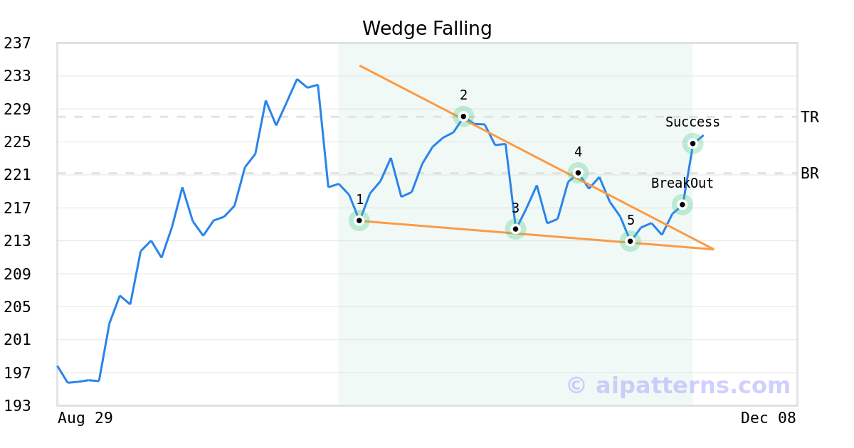 On November 17, 2025, A.I.dvisor detected a Wedge Falling Pattern (Bullish) for Madison Square Garden Sports Corp (MSGS, $212.91). On November 24, 2025, A.I.dvisor confirmed the Bullish pattern, setting a target price of $228.05. 1 day later, on November 25, 2025, MSGS reached the target price resulting in a for traders who took a long position in the stock.