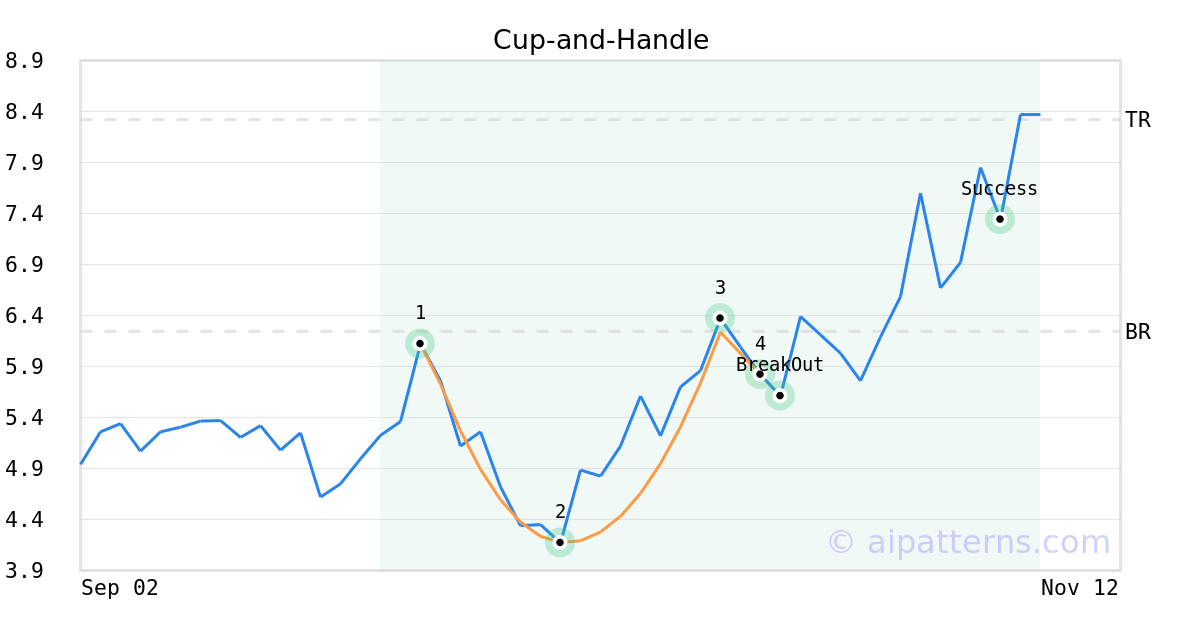 On October 20, 2025, A.I.dvisor detected a Cup-and-Handle Pattern (Bullish) for T-REX 2X Inverse MSTR Daily Target ETF (MSTZ, $5.82). On October 21, 2025, A.I.dvisor confirmed the Bullish pattern, setting a target price of $8.32. 15 days later, on November 05, 2025, MSTZ reached the target price resulting in a +2 for traders who took a long position in the stock.