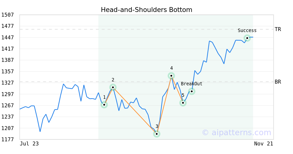 On October 10, 2025, A.I.dvisor detected a Head-and-Shoulders Bottom Pattern (Bullish) for Mettler-Toledo International (MTD, $1273.67). On October 15, 2025, A.I.dvisor confirmed the Bullish pattern, setting a target price of $1468.56. 27 days later, on November 11, 2025, MTD reached the target price resulting in a +1 for traders who took a long position in the stock.